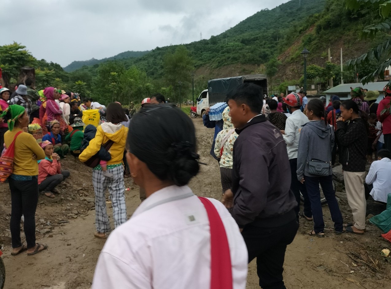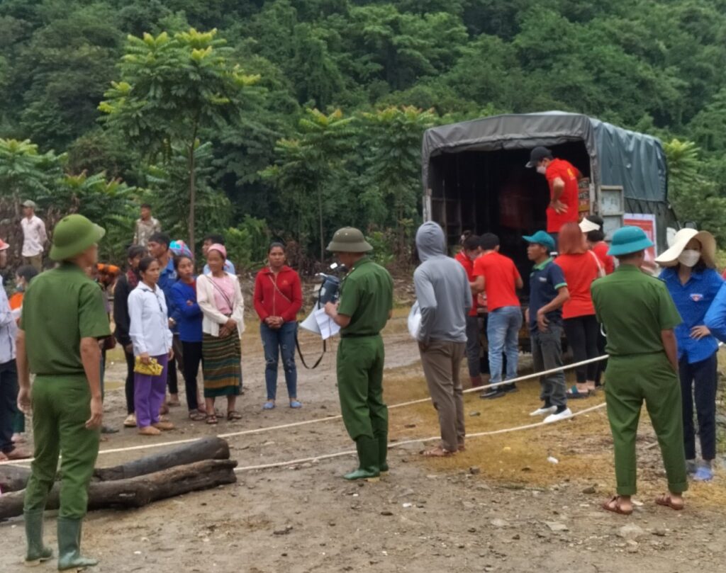 Đoàn phối hợp cùng với các lực lượng công an dân quân địa phương tổ chức trao quà cho người dân vùng lũ