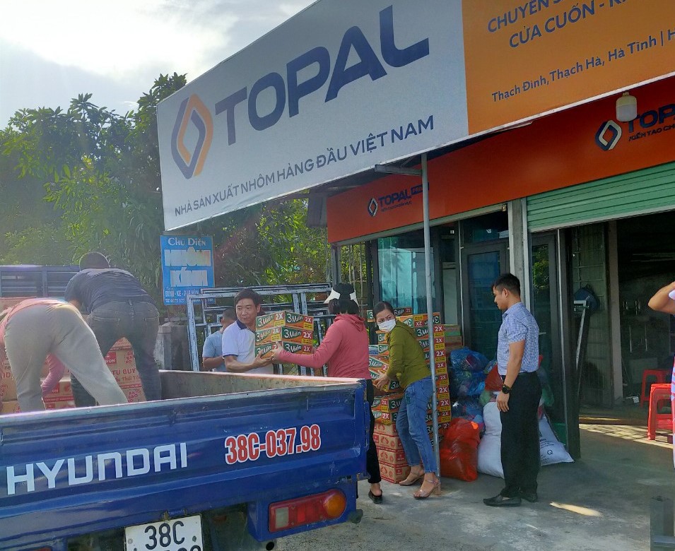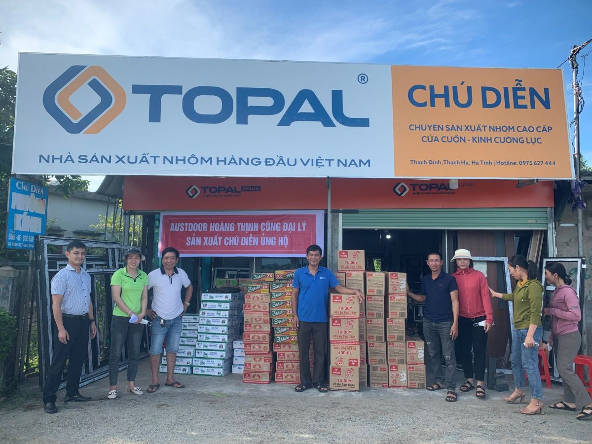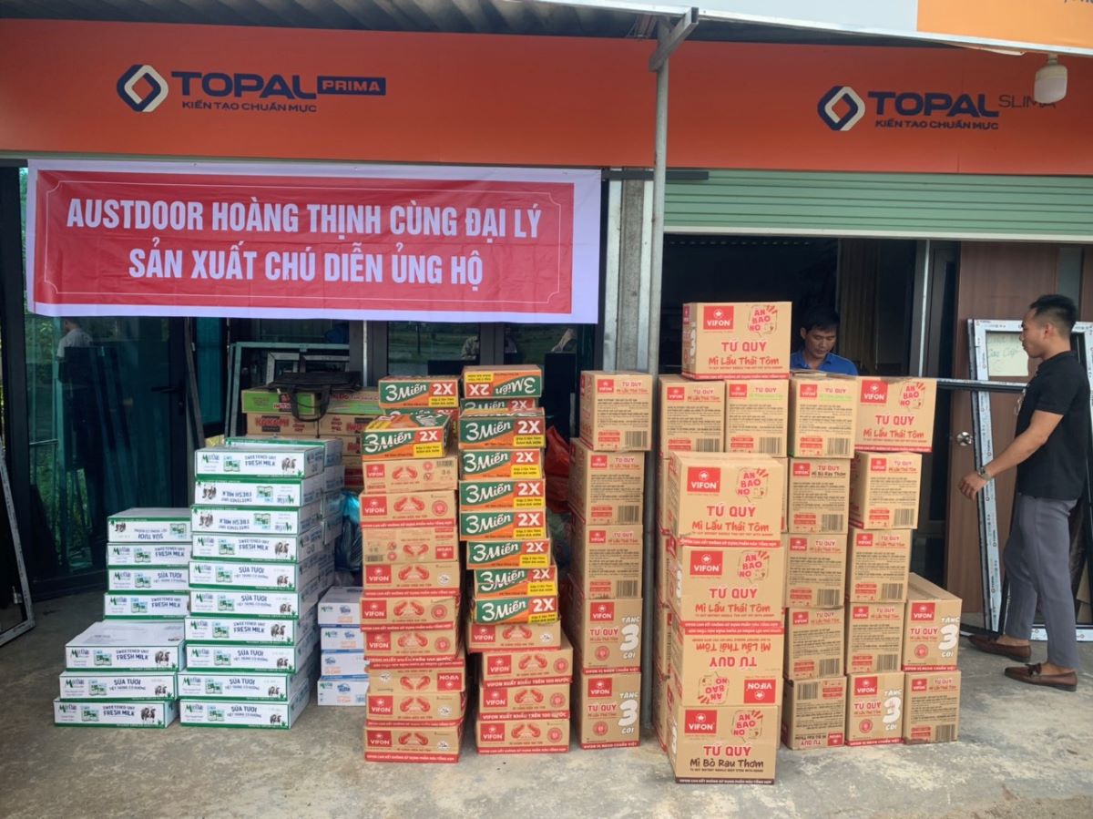 Trước sự thiệt hại lớn do hoàn lưu bão số 4 gây ra cho người dân tỉnh Nghệ An, Nhà phân phối Austdoor Hoàng Thịnh Hà Tĩnh phối hợp với đại lý sản xuất Chú Diễn trong khu vực đã ủng hộ 131 thùng mì gói và sữa tươi trị giá hiện vật gần 18 triệu đồng.